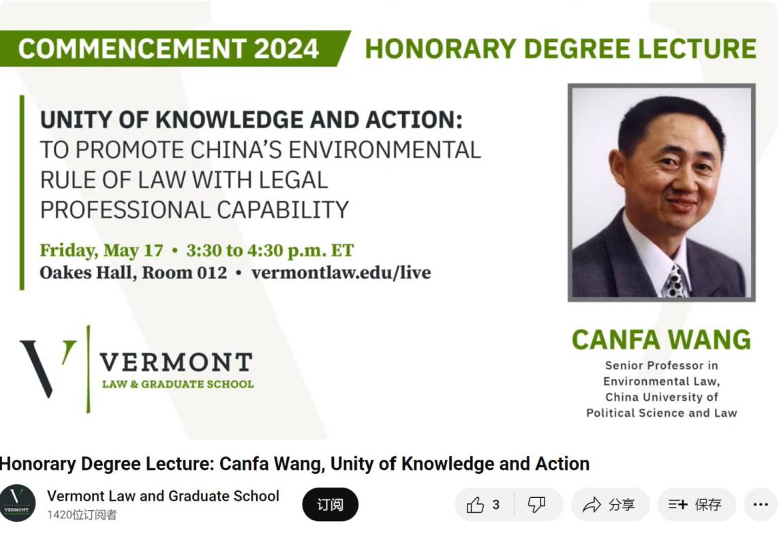 Founded in 1972, VLGS is renowned for its preeminence in environmental law, consistently leading the field among U.S. law schools. Prof. Wang Canfa is the inaugural international recipient of an honorary Doctor of Laws degree from VLGS, a testament to his exceptional contributions to the field.
